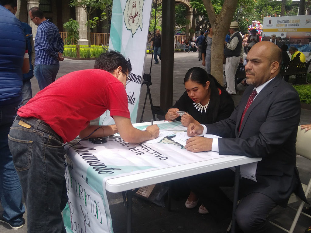Cuernavaca, Morelos; 24 de julio de 2017. Por segunda semana consecutiva, la barra de abogados del Estado de Morelos, instaló en Plaza de Armas un módulo de recolección de firmas de la ciudadanía que externa su rechazó a los daños que dejó el Paso Exprés tras el socavón que se hizo en el kilómetro 93 + 600.