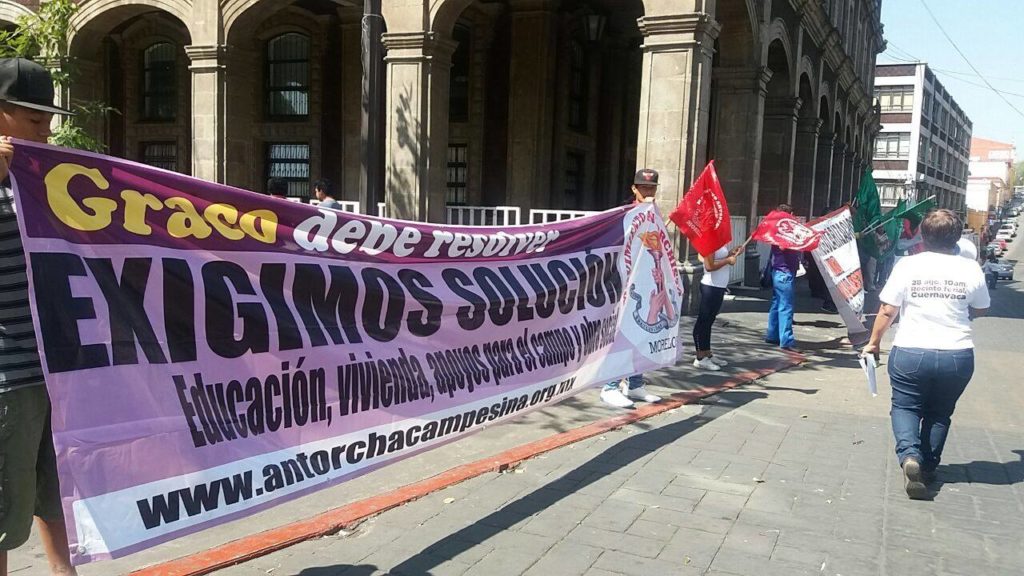 Cuernavaca, Morelos; 20 de marzo de 2017. Los integrantes del Movimiento Antorcha Campesina realizaron una cadena humana afuera de Palacio de Gobierno, para exigir al Poder Ejecutivo que cumpla con sus promesas de campaña y regularice los predios de Patios de la Estación.