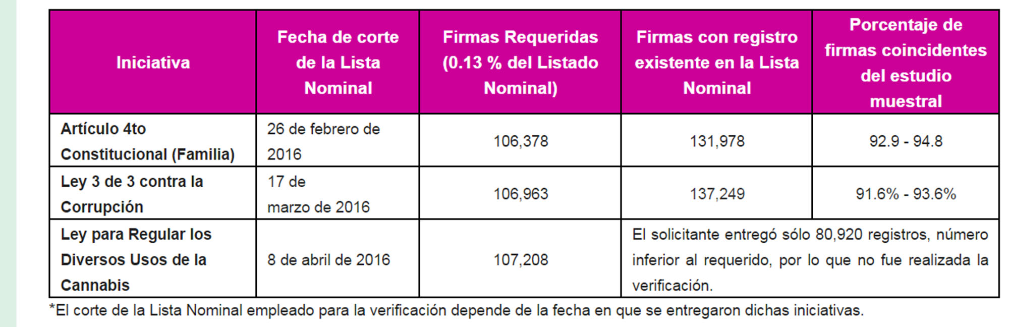 Para las Iniciativas que, de acuerdo con la verificación, obtuvieron el apoyo requerido de 0.13 por ciento respecto de la Lista Nominal, el INE elaboró un estudio muestral para estimar el porcentaje de firmas que coinciden con las resguardadas en la base de datos del Padrón Electoral, la muestra en cada caso fue de 2 mil 500 firmas.