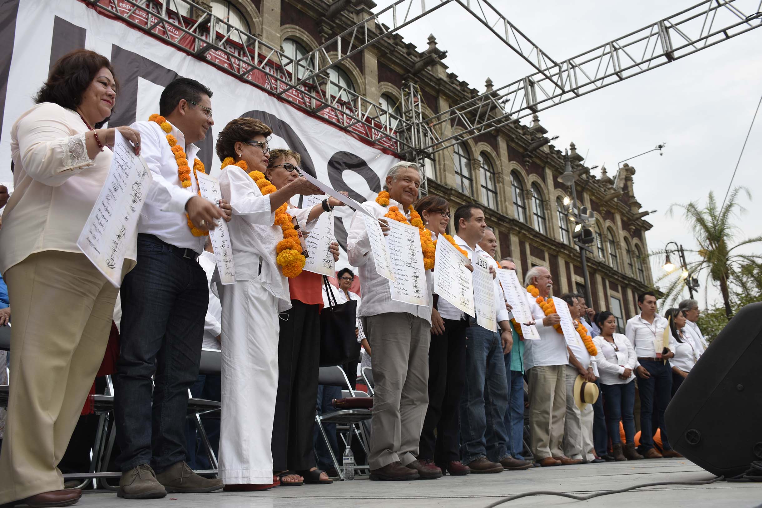 Con templete ubicado a las afueras de la sede del Poder Ejecutivo y un templete lleno de ex alcaldes perredistas de Jiutepec y Yautepec, diputado y senador federal morelenses y ex funcionarios como la ex secretaria de Seguridad Pública en Morelos, Alicia Vázquez Luna, representantes del medio periodístico, opositores del actual Gobierno en Morelos e integrantes del comité nacional de MORENA signaron junto con López Obrador el citado acuerdo político de unidad.