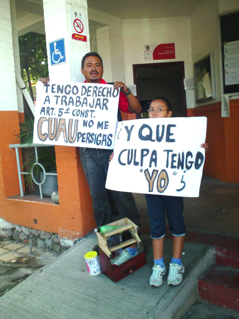 Cuernavaca, Morelos, 22 de julio de 2016. Acompañado de su hija, un lustrador de calzado en Cuernavaca, de nombre Raymundo Gil se manifestó en las inmediaciones del Ayuntamiento Capitalino para solicitar a la autoridad municipal información sobre cuál será el sitio en el cual él que no está adherido a nuevo Grupo Sindical  podrá bolear el calzado de la población.