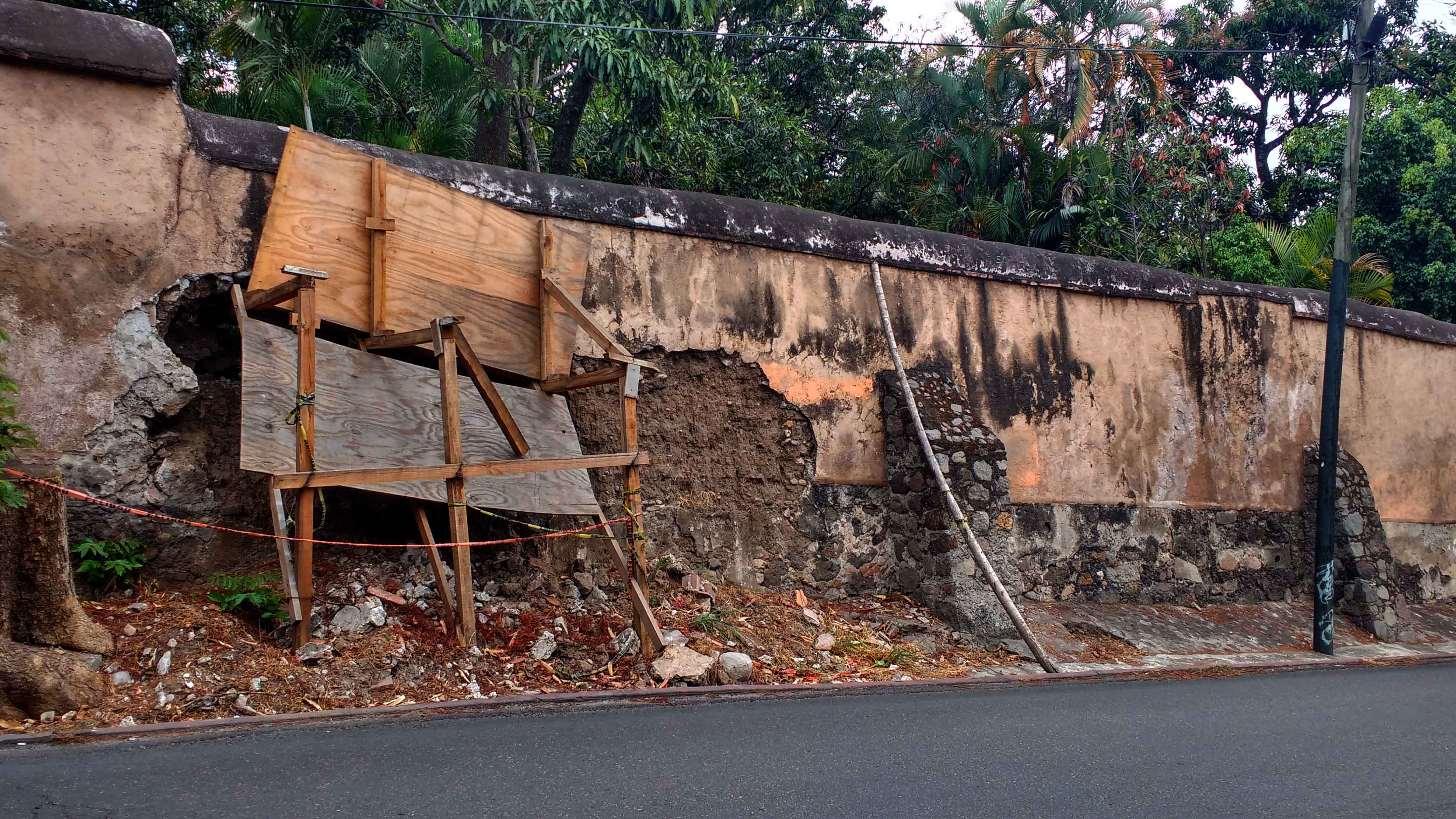 Cuernavaca, Morelos; 26 de abril de 2017. A pesar de que han pasado ocho meses desde que un pedazo de la barda trasera del Jardín Borda colapsara, ninguna autoridad ha intervenido para evitar el deterioro del edificio y el peligro mortal en que pone este muro a los automovilistas y peatones.