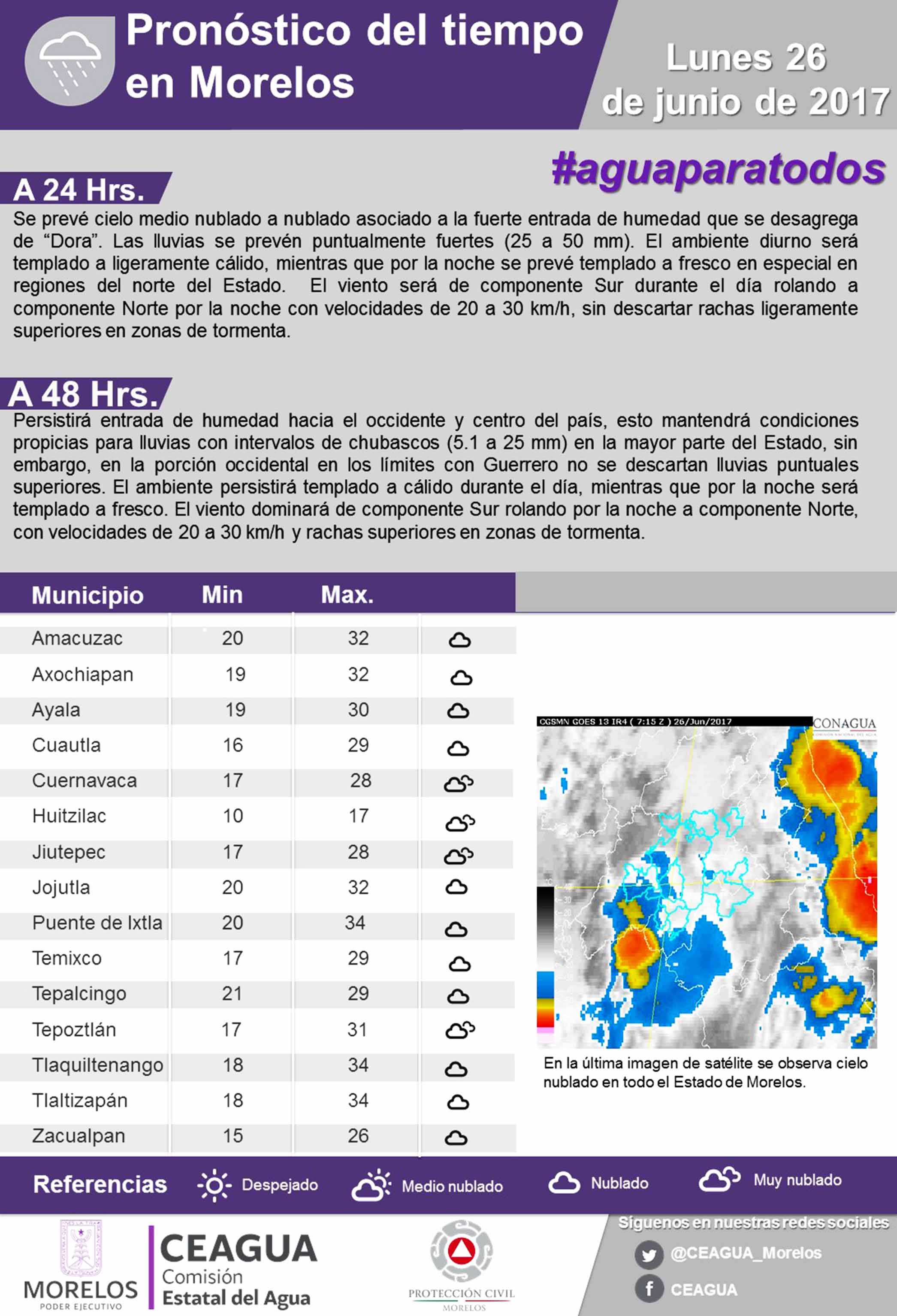 Cuernavaca, Morelos; 26 de junio de 2017. El secretario ejecutivo de la Comisión Estatal del Agua (Ceagua), Juan Carlos Valencia Vargas informó que el huracán “Dora” categoría uno, localizado al sur de las costas de Jalisco y Colima, así como la onda tropical número siete provocarán intervalos de chubascos con tormentas puntuales fuertes en las siguientes en Morelos.
