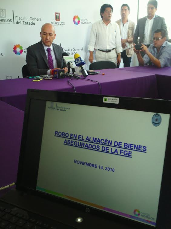 Cuernavaca, Morelos; 1 diciembre de 2016. El fiscal General del Estado Javier Pérez Durón ofreció una rueda de prensa en la cual informó sobre la detención de una persona involucrada en el robo del cuarto de evidencias de bienes asegurados.