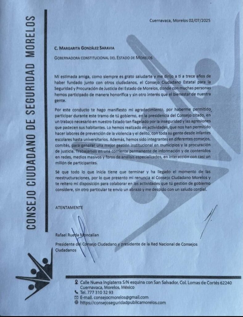 Cuernavaca, Morelos; 4 de julio de 2025. El pasado dos de julio, Rafael Rueda Moncalian presentó a la gobernadora Margarita González Saravia su renuncia al cargo de presidente del Consejo Ciudadano de Seguridad Pública y Procuración de Justicia, el cual desde hace once años encabezó de forma honorífica.