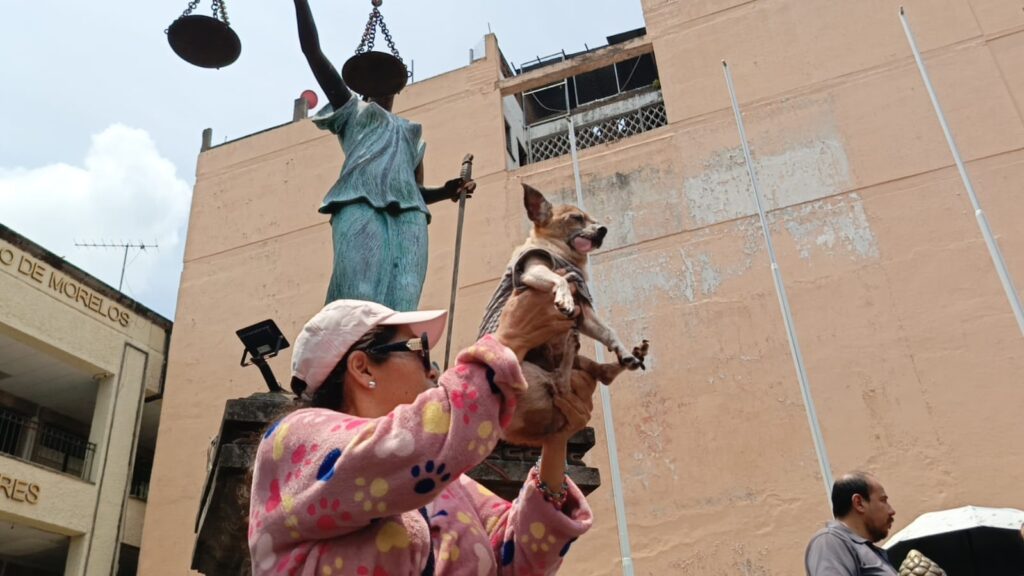 Este martes, los manifestantes aventaron croquetas a la estatua de la justicia y exigieron castigos severos contra quienes cometen actos de crueldad animal.