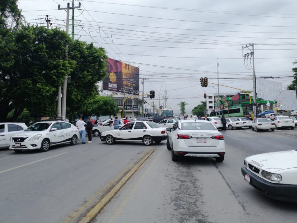Cuernavaca, Morelos; 9 de julio de 2025. Taxistas bloquearon por algunos minutos la avenida Plan de Ayala, esquina con Teopanzolco, para pedir la cancelación del pago de la tenencia que entrará en vigor en agosto para el transporte público, porque les parece injusto el cobro del tres por ciento sobre el valor del vehículo.