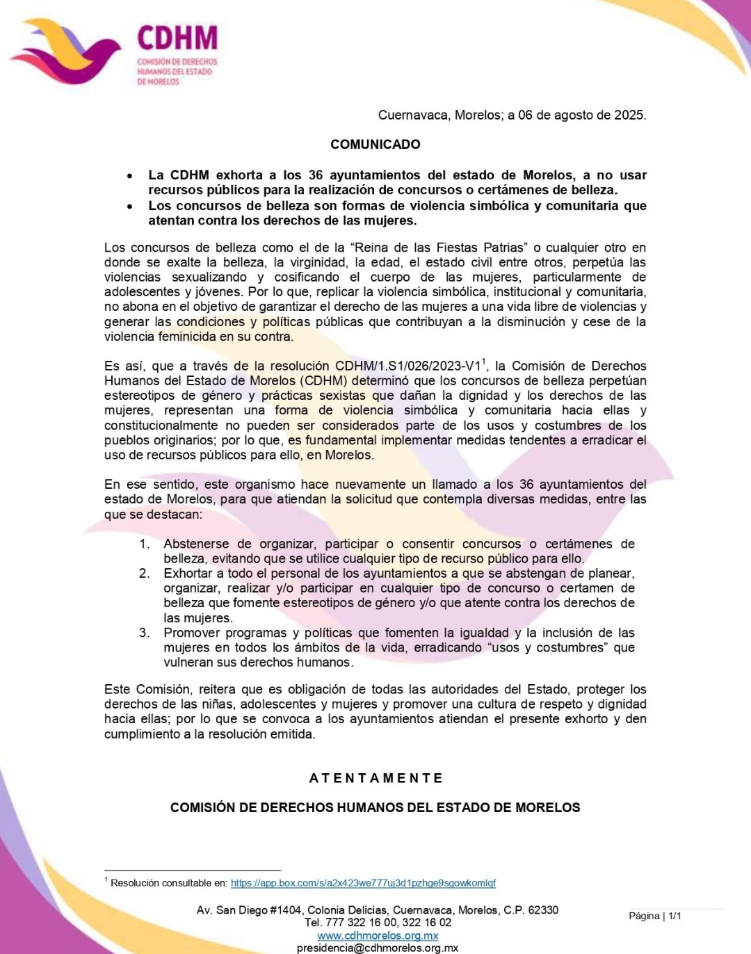 Cuernavaca, Morelos; 7 de agosto de 2025. Clarisa Gómez Manrique, titular de la Secretaría de las Mujeres estatal, aplaudió el exhorto que emitió la Comisión de Derechos Humanos del estado de Morelos (CDHM) sobre su oposición a la realización de certámenes de belleza durante el mes patrio en los ayuntamientos.