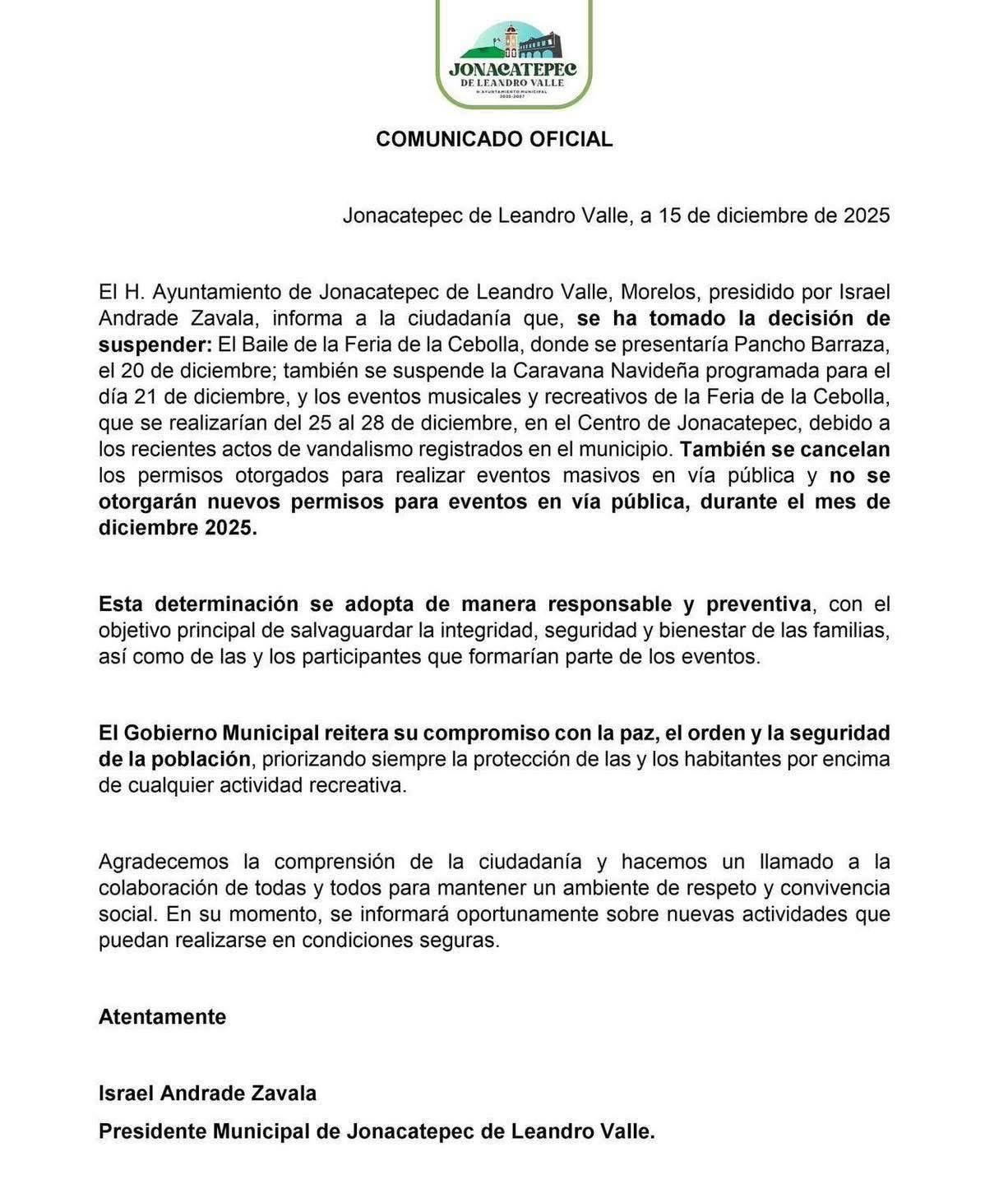 Cuernavaca, Morelos; 16 de diciembre de 2025. Tras los hechos de vandalismo que se presentaron hace quince días por el atropellamiento de un menor de edad, y bajo el argumento de preservar la paz y seguridad de quienes viven en Jonacatepec, el ayuntamiento informó que se suspenden las actividades de la «Feria de la cebolla 2025».