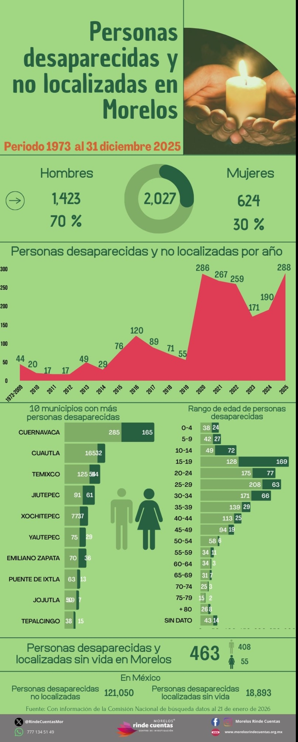 Respecto a dicha información se detalla que, del año 1973 al 31 de diciembre del 2025, en Morelos se ha denunciado un total de dos mil 27 desapariciones de mujeres y hombres de diferentes grupos etarios; el mayor número de personas desaparecidas corresponde, en un 70 por ciento, a hombres, lo que equivale a mil 423 masculinos desaparecidos, mientras que en el caso de las mujeres representa un 30 por ciento, equivalente a 624 mujeres que fueron reportadas como desaparecidas.