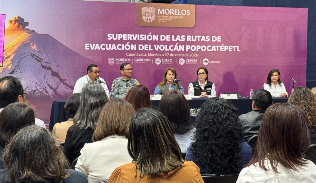 Cuernavaca, Morelos; 27 de enero de 2026. En visita al estado de Morelos, la titular de la Coordinación Nacional de Protección Civil (CNPC), Laura Velázquez Alzúa, informó que se inició un proceso de revisión de las rutas de evacuación aledañas al volcán Popocatépetl, en cuatro entidades federativas.