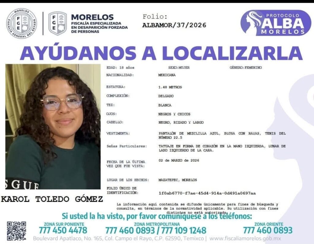 El pasado lunes, la FGE publicó una ficha de búsqueda en la que hizo mención que la joven de 18 años de edad y estatura de un metro con 48 centímetros, tez blanca, cabello largo y rizado de color negro, desapareció el pasado dos de marzo en Mazatepec.