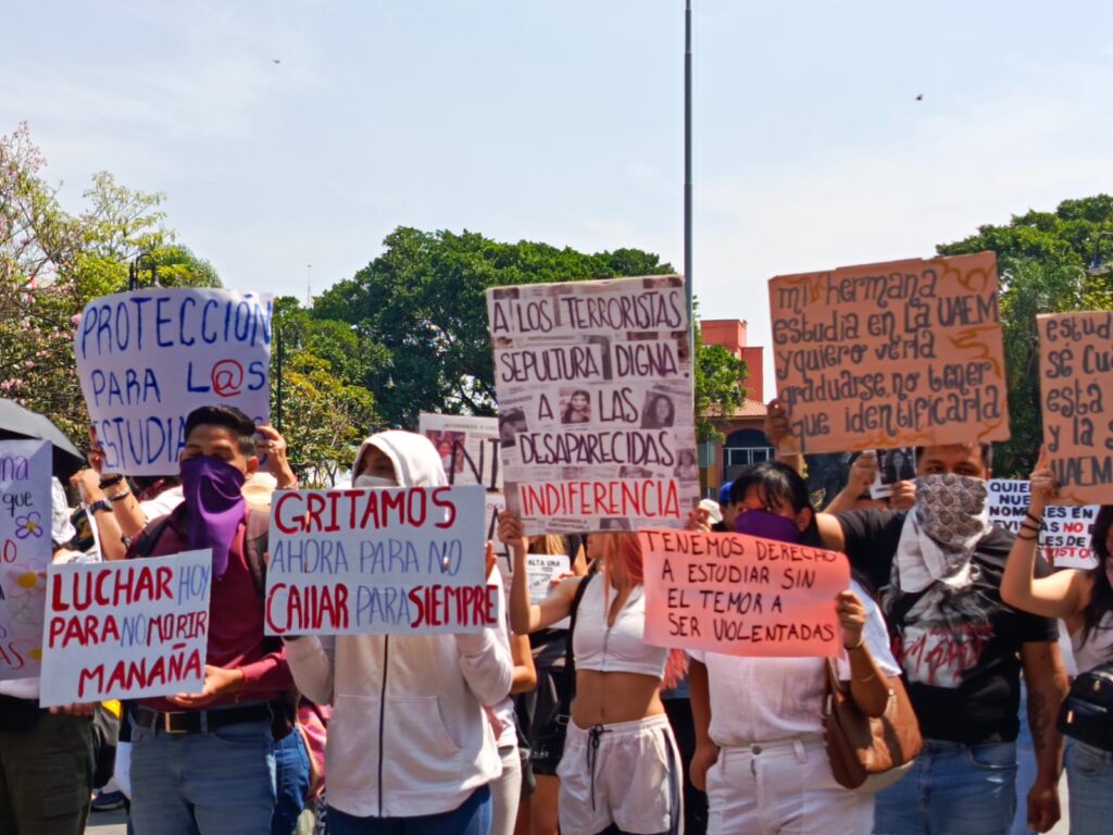 Cuernavaca, Morelos; 11 de marzo de 2026. Estudiantes universitarios marcharon nuevamente para exigir justicia por los feminicidios de sus compañeras Kimberly Joselin y Karol, reportadas como desaparecidas y posteriormente localizadas sin vida; de igual modo, los manifestantes pidieron mayor seguridad.