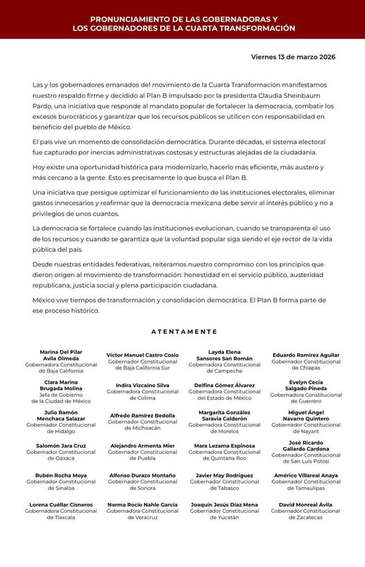 La gobernadora Margarita González Saravia, expresó su respaldo al Plan B de la reforma electoral impulsado por la Presidenta Claudia Sheinbaum Pardo, en el marco de la postura asumida por la Conferencia Nacional de Gobernadoras y Gobernadores (CONAGO), al considerar que se trata de una propuesta orientada a fortalecer la democracia, eliminar privilegios y garantizar que los recursos públicos se utilicen con responsabilidad, priorizando siempre el bienestar del pueblo y la participación ciudadana en la vida pública del país.